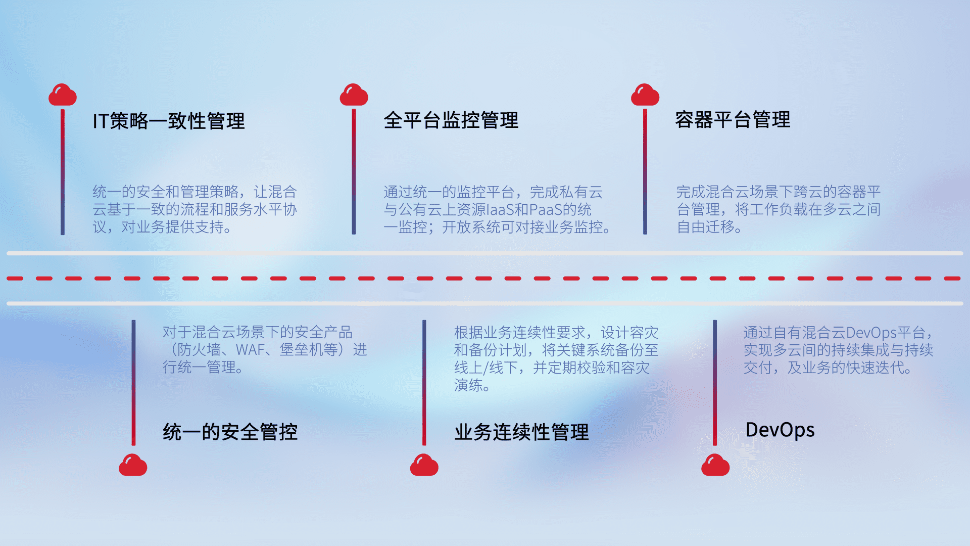 通过多云纳管,,以统一的资源数据模型把客户的云资源进行抽象和封装,,,,进而实现对多云资源的统一操作,,保障云资源管理的可靠性、、、稳定性与可用性。。。量身定制化运维内容,,配置、、、开发运维、、、、补丁管理、、、备份、、监控、、、、认证和访问管理、、审计和日常巡检等,,,保障在用云过程中的可靠度,,,,稳定度以及高可用率。。。